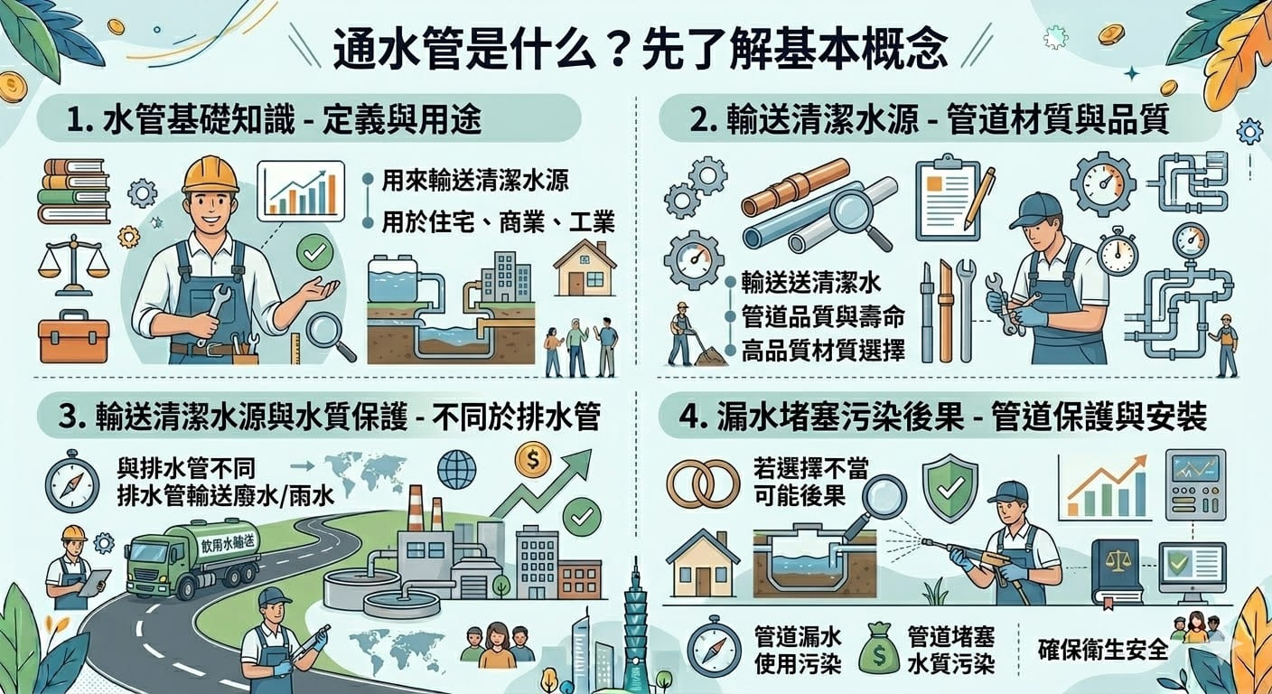 通水管是用來輸送水的管道,通常用於住宅、商業或工業設施中。它與排水管不同,排水管負責將廢水或雨水排出,而通水管則負責供應清潔水源。通水管的品質直接影響到水流穩定性與水質保護,若選擇不當,可能會導致漏水、管道堵塞或水質污染等問題。