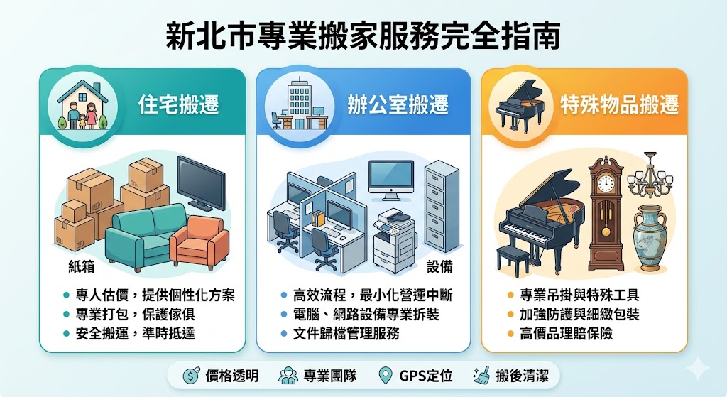 全方位搬家、部分搬遷、長途搬家等。根據需求選擇合適的服務,例如全方位搬家適合需要打包與拆卸的搬遷,部分搬遷則僅需部分搬運服務。 - 新北搬家公司提供的特殊服務: