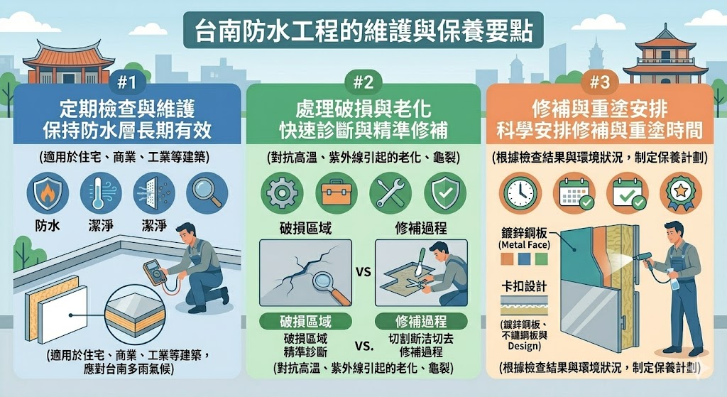 防水層應定期進行重塗或修補。根據使用環境與材料的不同,每2至3年進行一次檢查和保養是比較理想的安排。